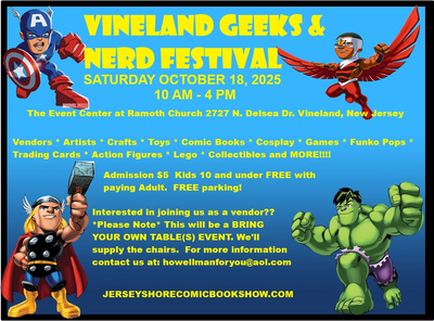 Calling all Geeks and Nerds!! This is the show for you! Join us for the first ever Geeks and Nerd Festival to be held in Vineland! This event will be taking place on Saturday October 18, 2025 from 10am to 4pm at the Event Center at Ramoth Church located at 2727 N. Delsea Dr. in Vineland, New Jersey.